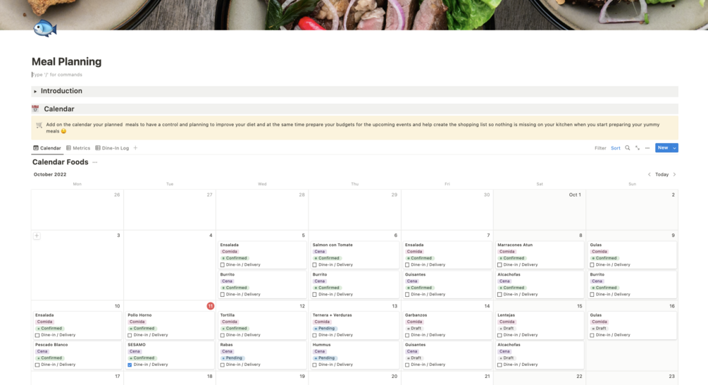 This Notion template will help you to keep track of your upcoming and past meals to be able to organize your deals hoping for healthier and most efficient nutrition in the medium-large term.